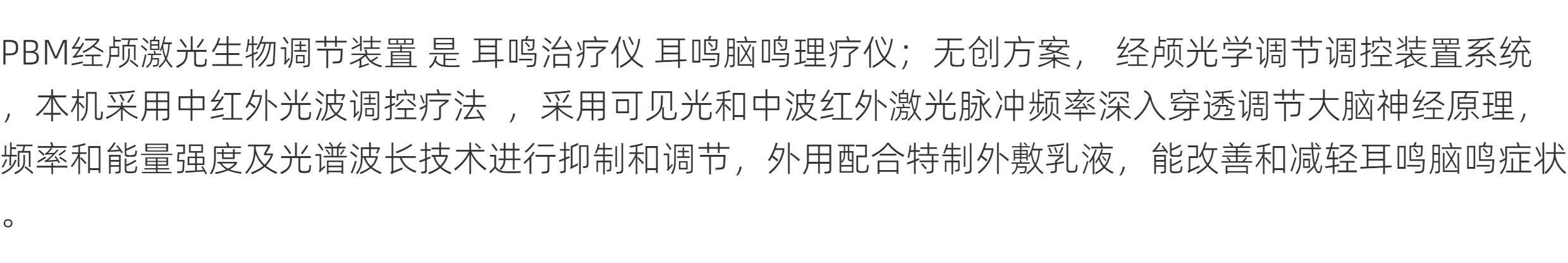 PBM经颅激光生物调节装置 是 耳鸣治疗仪 耳鸣脑鸣理疗仪;无创方案, 经颅光学调节调控装置系统,本机采用中红外光波调控疗法 ,采用可见光和中波红外激光脉冲频率深入穿透调节大脑神经原理,频率和能量强度及光谱波长技术进行抑制和调节,外用配合特制外敷乳液,能改善和减轻耳鸣脑鸣症状。